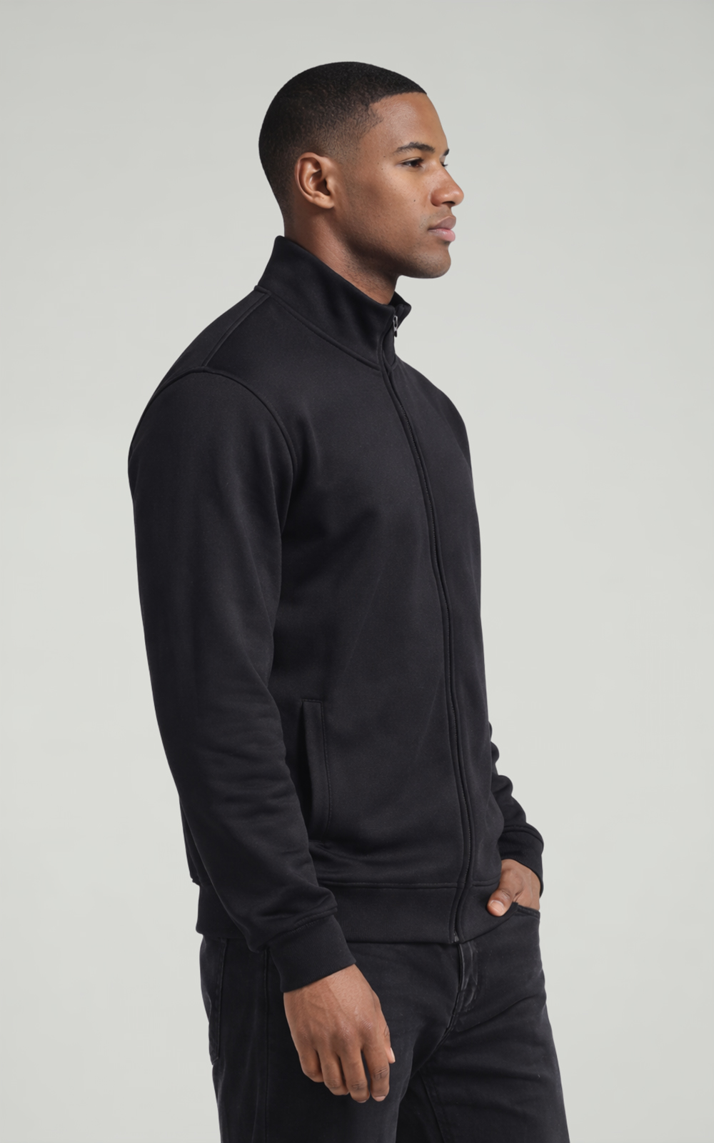 Maniche montate; Tagliata e cucita; Polsini e fondo del capo a costina 1×1; 2 tasche laterali con zip; Chiusura centrale con zip nascosta; Zip in plastica a iniezione tono su tono con tirazip in metallo tono su tono; Mezzaluna e nastro di rinforzo in jersey sul collo
