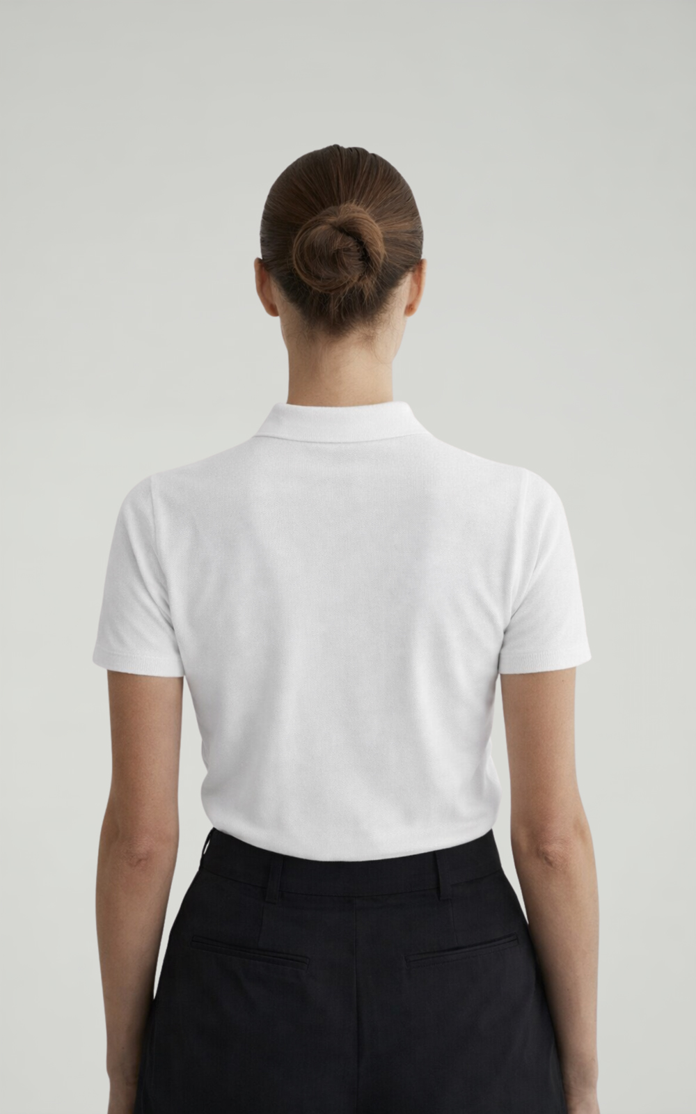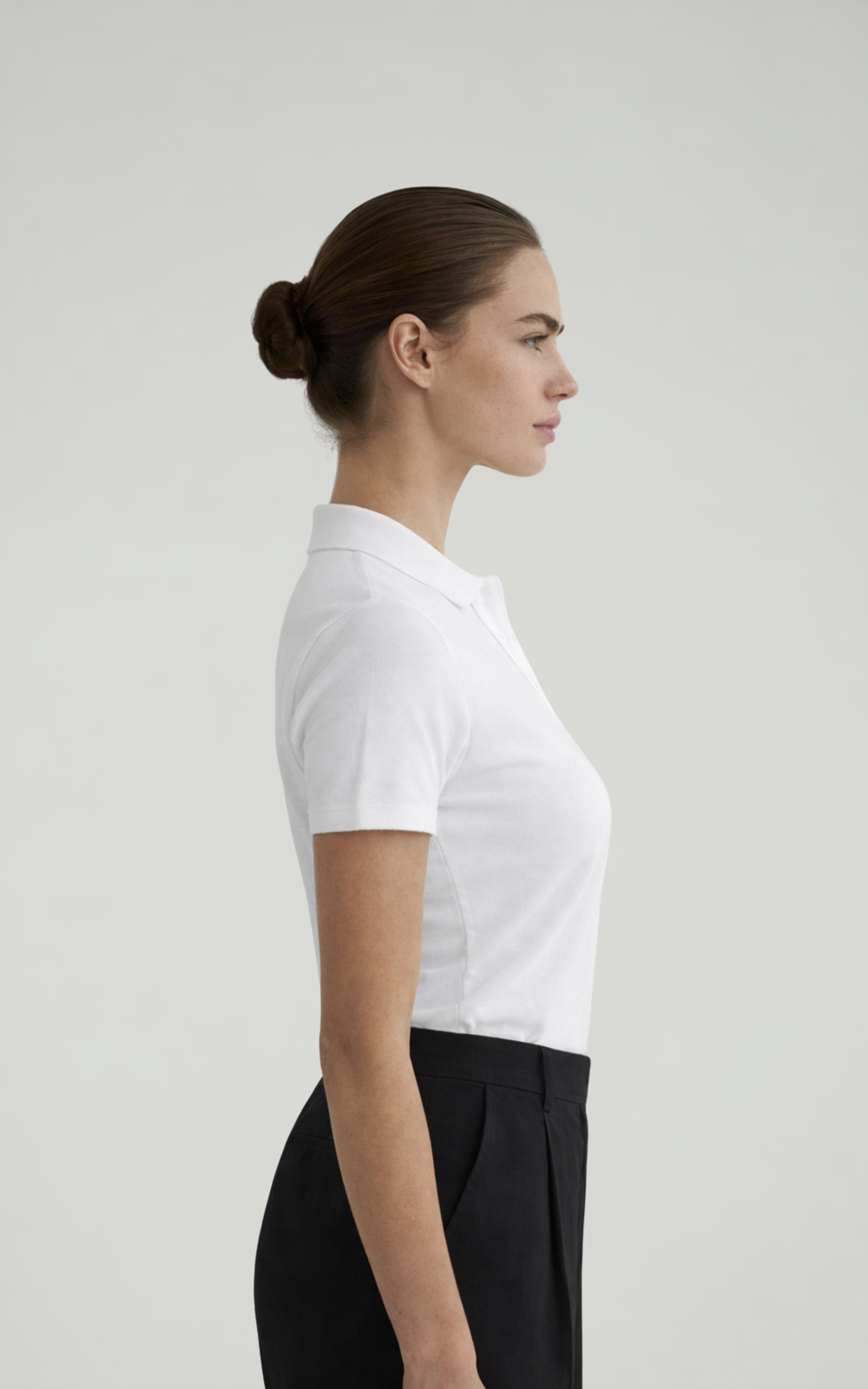 NEW FIT, Collo a costina, Nastro di rinforzo sul collo, Patta rinforzata, Maniche corte, Patta con 3 bottoni tono su tono, Fondo dritto, Tagliata e cucita, Bottone di ricambio sulla cucitura laterale interna